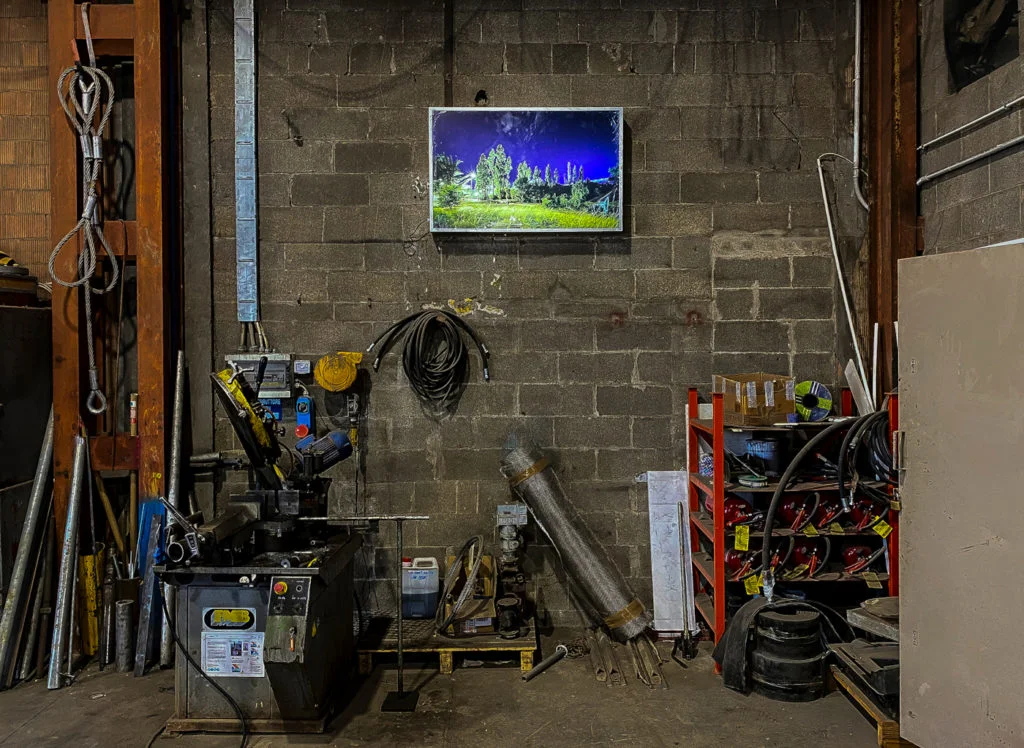 Negli scatti di Luca Santiago Mora, esperto arti visive e noto fotografo di architettura, si assiste invece a un cambio di ruoli: le strutture industriali, da soggetto principale, diventano solo una parte di esso, che è costituito invece, come scrive il curatore della mostra, De Luigi, da “ciò che la fabbrica vede intorno a sé, le persone, gli automezzi, i materiali, ma soprattutto la natura, gli alberi”.
