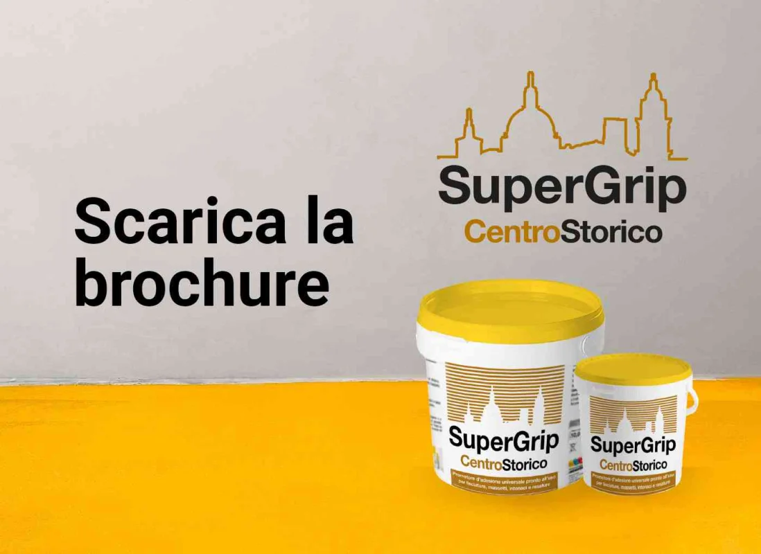 SuperGrip CentroStorico, a base di resine in dispersione acquosa, sabbie silicee selezionate, privo di solventi per una superficie d’aggancio ruvida, è il promotore d’adesione ideale per lisciature e massetti: