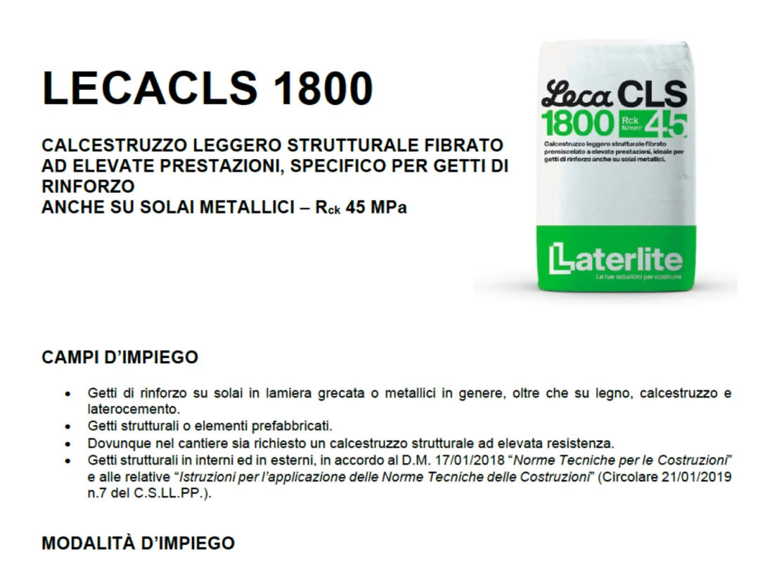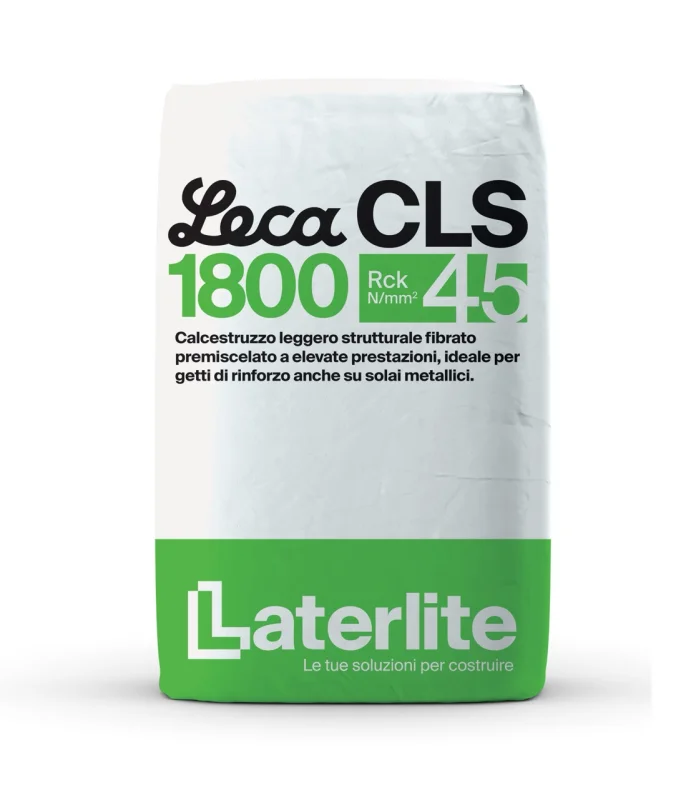 Calcestruzzo leggero strutturale fibrato ad alte prestazioni per getti di rinforzo e solette collaboranti, costituito da premiscelato “Leca® CLS 1800” a base di argilla espansa Leca® Strutturale, inerti naturali, cemento tipo Portland, fibre polimeriche e additivi. Classe di massa volumica D1.9 (circa 1800 kg/m3), classe di resistenza LC 40/44 e classe di esposizione X0-XC1-XC2-XC3- XC4-XD1- XD2- XD3- XF1- XA1 (secondo UNI EN 206 & UNI 11104), XS1-XS2-XS3 (secondo UNI EN 206) e XA2-XA3 (secondo UNI 11104). Resistenza a compressione certificata Rck 45 MPa, modulo elastico certificato E 25000 MPa e conducibilità termica λ 0.70 W/mK. Confezionamento e posa in opera secondo le indicazioni del produttore.