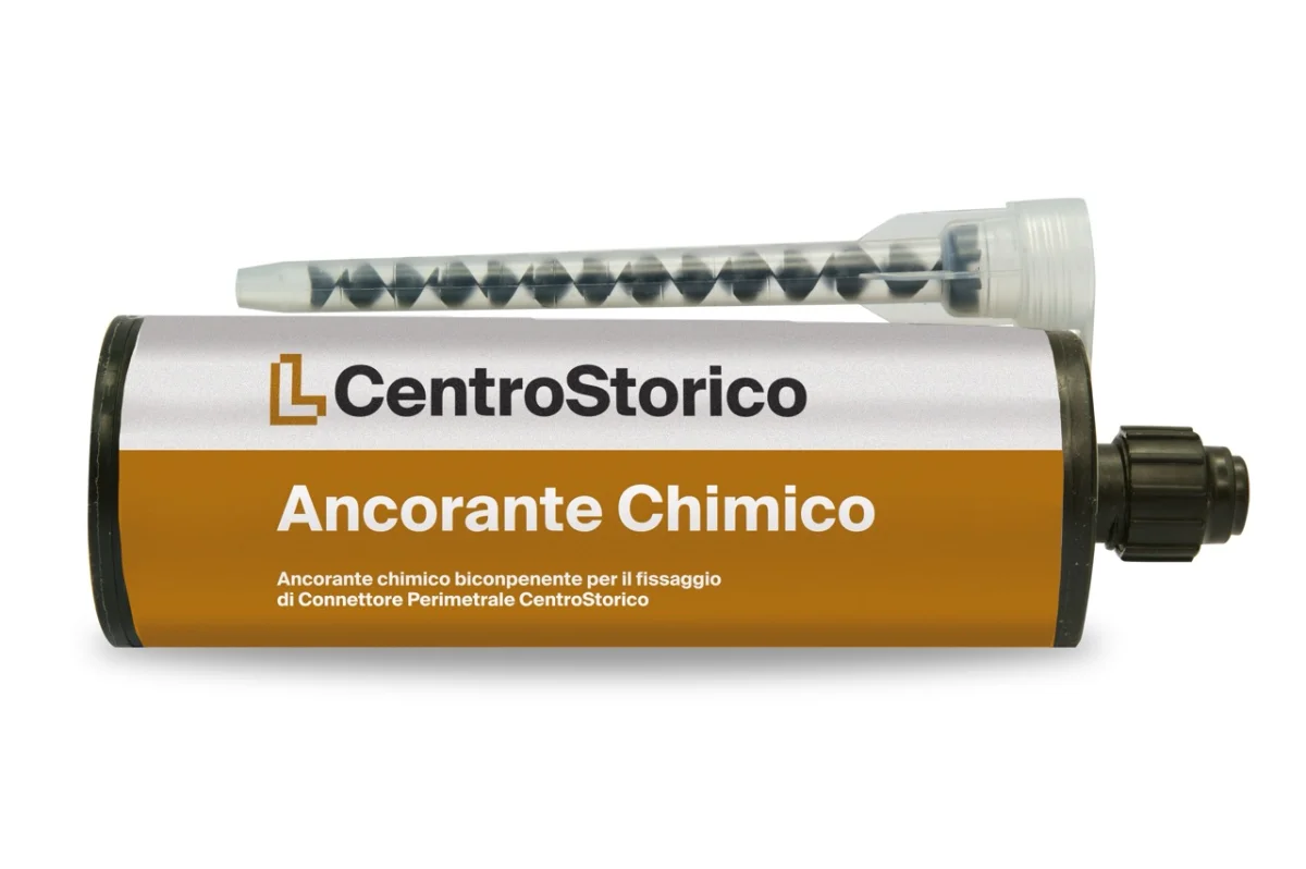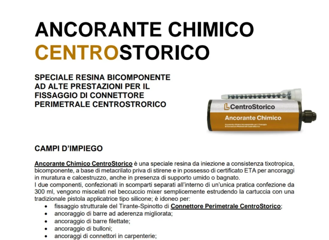 Ancorante Chimico CentroStorico è una speciale resina metacrilato priva di stirene a consistenza tixotropica, bicomponente per l’ancoraggio chimico e il fissaggio strutturale del Connettore Perimetrale all’interno delle pareti sismo-resistenti.