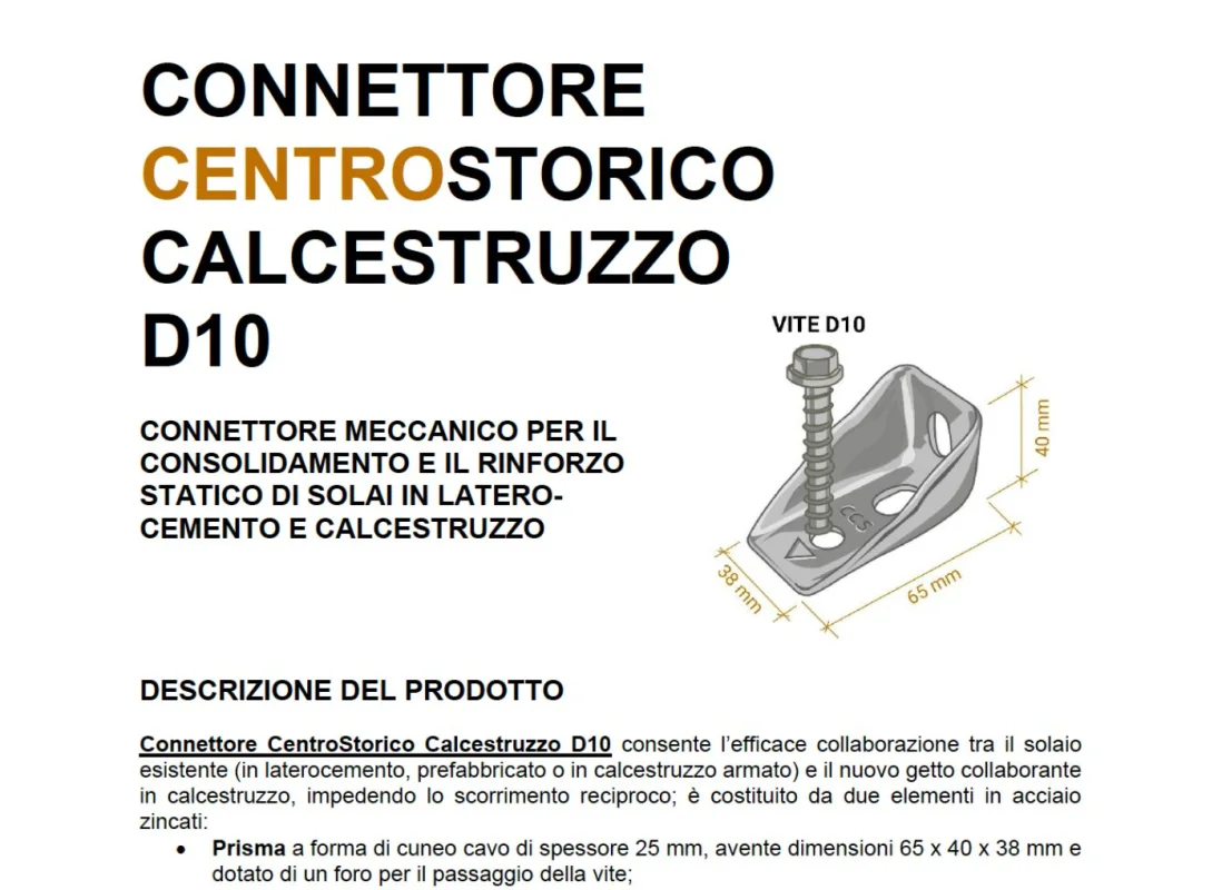 Il sistema di consolidamento consente il rinforzo strutturale e l’irrigidimento dell’elemento portante con significativi benefici statici e di comfort abitativo. Connettore CentroStorico Calcestruzzo risulta ottimale per il rinforzo dei i solai a travetti prefabbricati in laterocemento (ad esempio tipo “bausta”), grazie al vantaggio di una soluzione sicura e certificata.