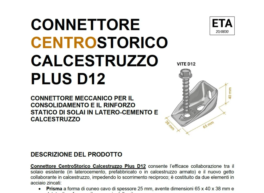 – Connettore Calcestruzzo PLUS con vite D12 ideale in presenza di solai con luci importanti (luci ≥ 4,5-5 m) o laddove sia richiesto un consolidamento con superiore prestazione meccanica. Connettore Calcestruzzo PLUS grazie alla vite con sezione (12 mm) e lunghezza (70 mm) maggiorata assicura migliori performance sino al 20% in più rispetto al connettore vite D10;