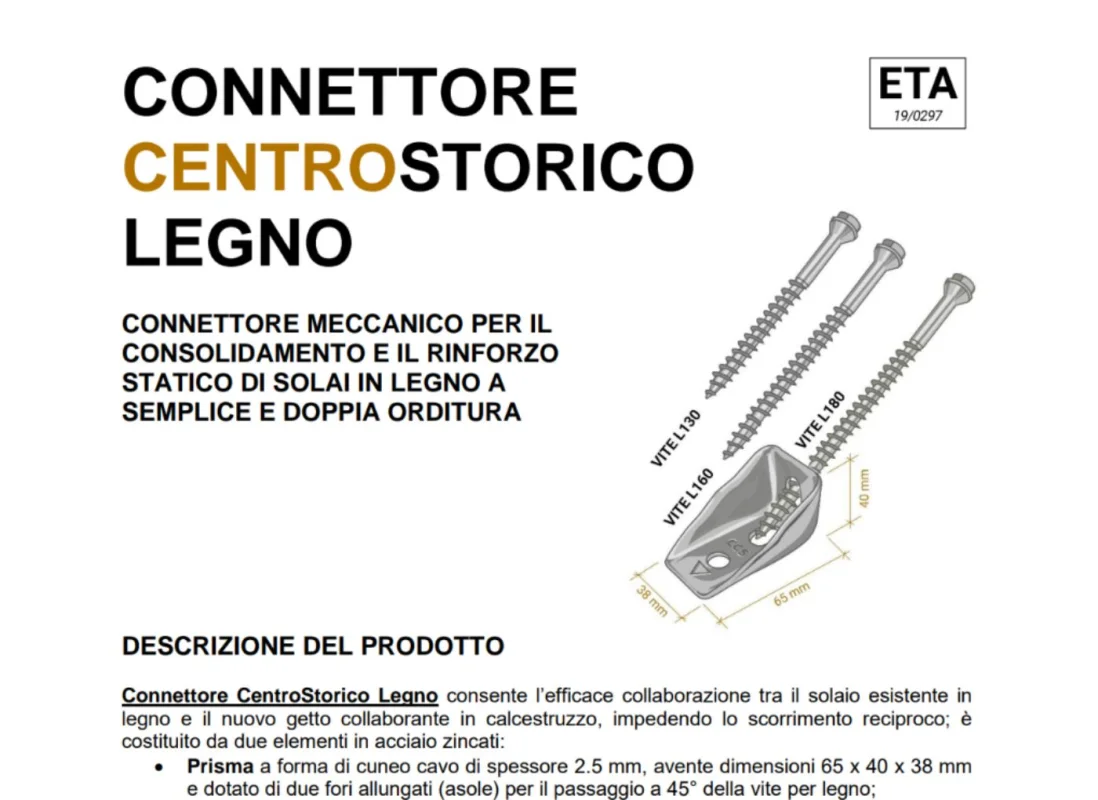– Connettore Legno PLUS con vite L180 mm e sezione maggiorata (12 mm), ideale per solai con luci importanti (luci ≥ 4,5-5 m) o laddove sia richiesto un consolidamento con superiore prestazione meccanica;