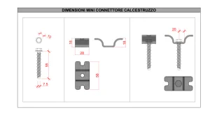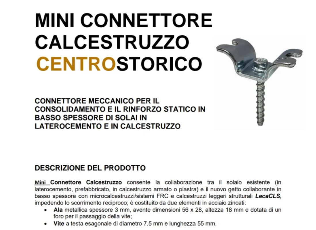 “Mini Connettore Calcestruzzo”, sistema di rinforzo per il consolidamento di solai in calcestruzzo e laterocemento, composto da un elemento di collegamento in acciaio zincato di spessore 3 mm, di dimensioni 56 x 28 x 18 mm, avente un foro per il passaggio di una vite per calcestruzzo in acciaio zincato di diametro 7.5 mm e lunghezza 55 mm.