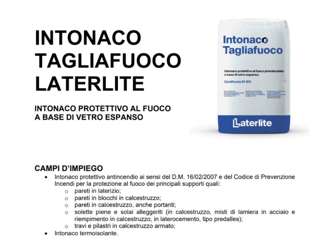 Intonaco Tagliafuoco Laterlite è l’intonaco tagliafuoco certificato a base di vetro espanso.