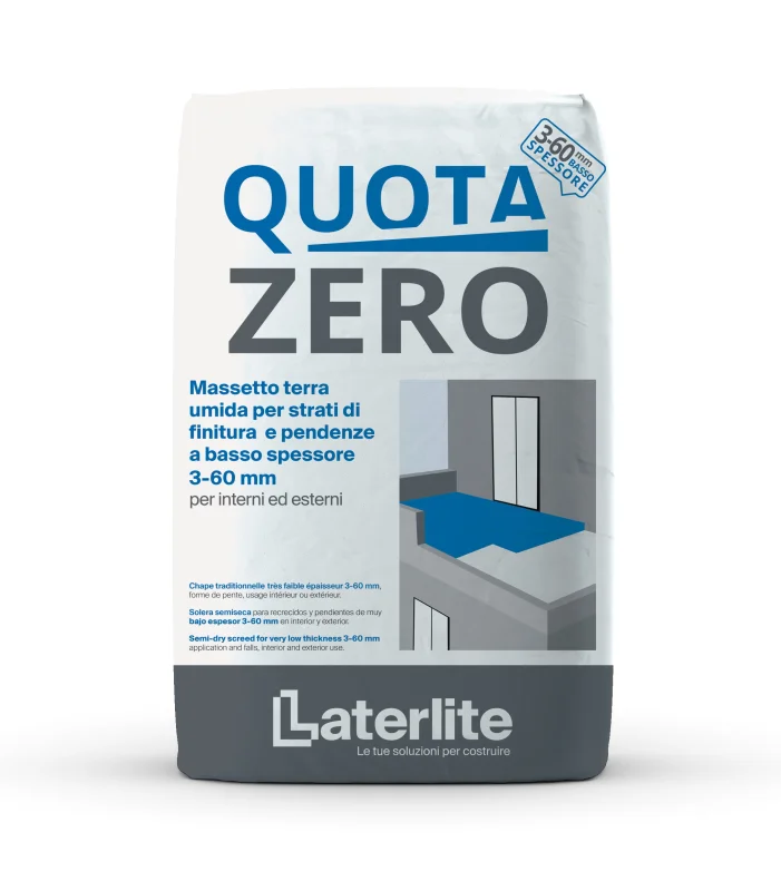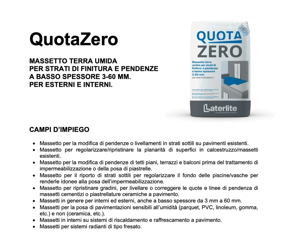 Massetto di finitura per interni ed esterni a basso spessore da 3 a 60 mm adatto a ricevere la posa diretta di pavimenti incollati (anche sensibili all’umidità), costituito da premiscelato “QUOTAZERO” a base di inerti selezionati, leganti specifici e additivi. Densità in opera circa 2.100 kg/m3 , a ritiro controllato < 400 µm/m per superfici senza giunti sino a 50 m2 , resistenza media a compressione certificata 25 N/mm2 , consistenza terra-umida plastica conducibilità termica certificata λ 1,48 W/mK, asciugatura in circa 24h dal getto per spessore 1 cm (2% umidità residua, con igrometro al carburo). Marcato CE secondo UNI EN 13813. Confezionamento e posa in opera secondo le indicazioni del produttore.