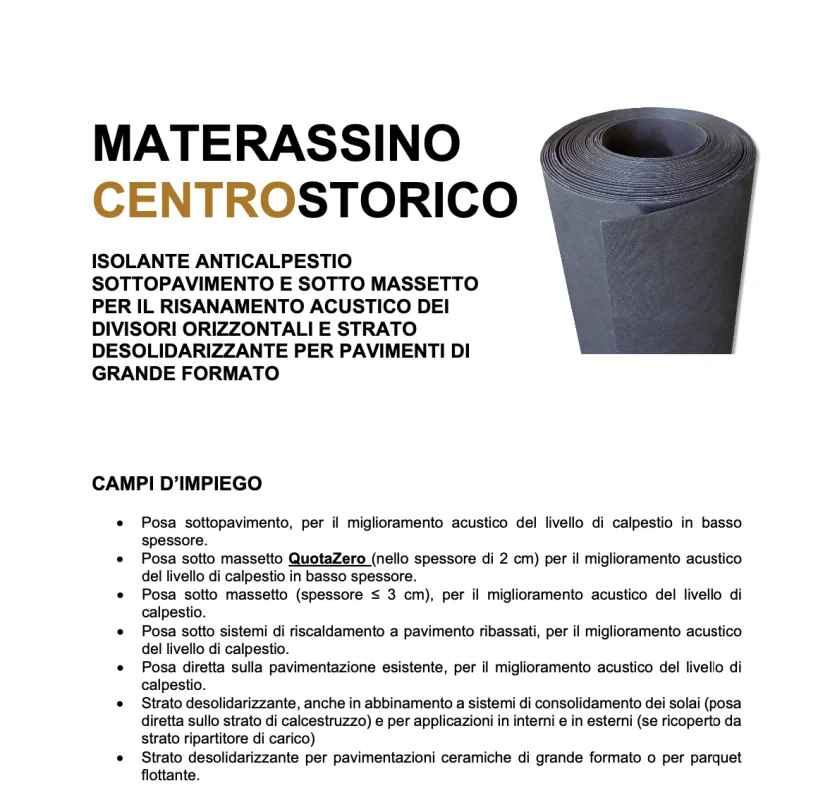 Materassino CentroStorico è idoneo anche alla posa flottante o “semi-flottante” di parquet, di qualunque tipologia e formato. Nel caso della posa flottante non vengono utilizzati collanti; nel caso invece della posa “semi-flottante” il collante può essere inserito tra massetto e materassino oppure tra materassino e parquet. La posa “semi-flottante” è utilizzabile anche per la pavimentazione ceramica, con i teli di Materassino CentroStorico stesi senza colla sul supporto, accostati e nastrati, e le piastrelle incollate sui teli.