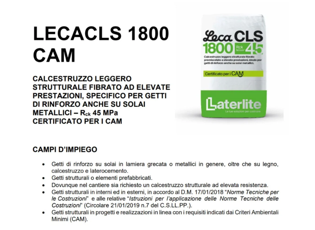 Calcestruzzo leggero strutturale fibrato ad alte prestazioni per getti di rinforzo e solette collaboranti certificato per i CAM costituito da premiscelato “Leca® CLS 1800 CAM” a base di argilla espansa Leca® Strutturale, inerti naturali, fibre polimeriche, additivi e materiale di riciclo (≥5%). Classe di massa volumica D1.9 (circa 1800 kg/m3), classe di resistenza LC 40/44 e classe di esposizione X0-XC1-XC2-XC3-XC4-XS1-XS2-XS3-XD1-XD2-XD3-XF1-XA1 secondo UNI EN 206 e X0-XC1-XC2-XC3-XC4 -XD1-XD2-XD3-XF1-XA1-XA2-XA3 secondo UNI 11104. Resistenza a compressione certificata Rck 45 MPa, modulo elastico certificato E 25000 MPa e conducibilità termica λ 0.70 W/mK. Confezionamento e posa in opera secondo le indicazioni del produttore.