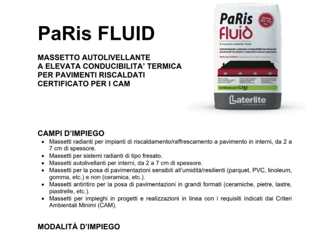 Massetto autolivellante ideale anche per sistemi di riscaldamento e raffrescamento a pavimento, antiritiro ed elevata conducibilità termica, certificato per i CAM, adatto a ricevere la posa diretta di pavimenti incollati (anche sensibili all’umidità), costituito da premiscelato “PaRis FLUID” a base di inerti selezionati, leganti specifici, additivi e materiale di riciclo (≥ 10%). Densità in opera ca. 2.200 kg/m3, a ritiro controllato < 0,2 mm/m per superfici senza giunti sino a 200 m2, resistenza media a compressione certificata 30 N/mm2, conducibilità termica certificata λ 1,60 W/mK, asciugatura in circa 4 gg. dal getto per spessore 2 cm (2% umidità residua, con igrometro al carburo). Marcato CE secondo UNI EN 13813. Confezionamento e posa in opera secondo le indicazioni del produttore.