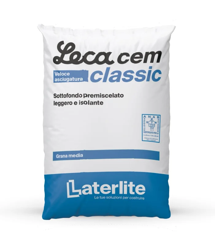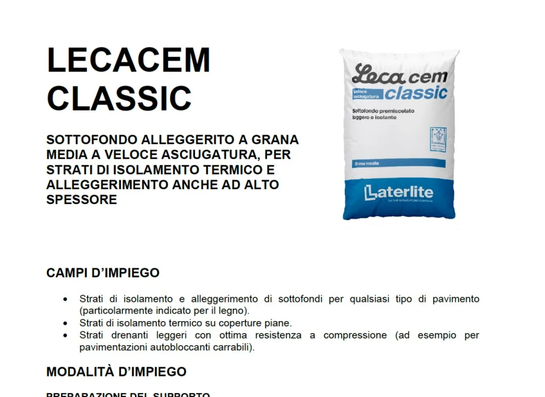 Leca®cem Classic è il premiscelato in sacco leggero e isolante a veloce asciugatura (spessore 5 cm asciutto in 7 gg. ) per la realizzazione di sottofondi alleggeriti, strati di isolamento termico, pendenze, coperture e strati di compensazione. Messo in opera ha una massa volumica di circa 600 kg/m³ e il suo basso coefficiente di conducibilità termica certificato (λ =0,134 W/mK), offre un grande contributo ai fini dell’isolamento termico dei divisori orizzontali interpiano.