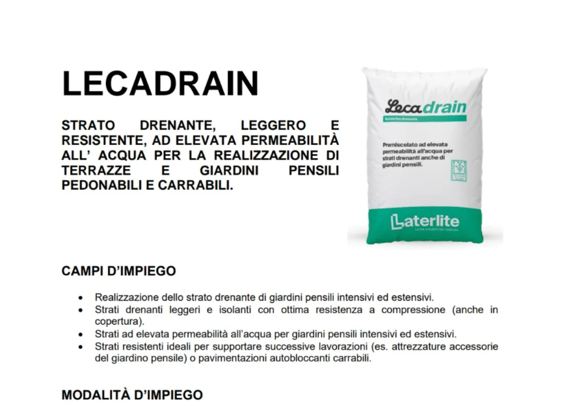 Strato di drenaggio per giardini pensili costituito da premiscelato “LecaDrain”, a base di argilla espansa Lecapiù e leganti specifici. Densità circa 520 kg/m3, capacità drenante nel piano certificata Cd=0,10-0,17-0,26 (rispettivamente con gradiente di carico i=0,02-0,04-0,08), resistenza alla compressione certificata 1,7 N/mm2 (a 200 kPa).